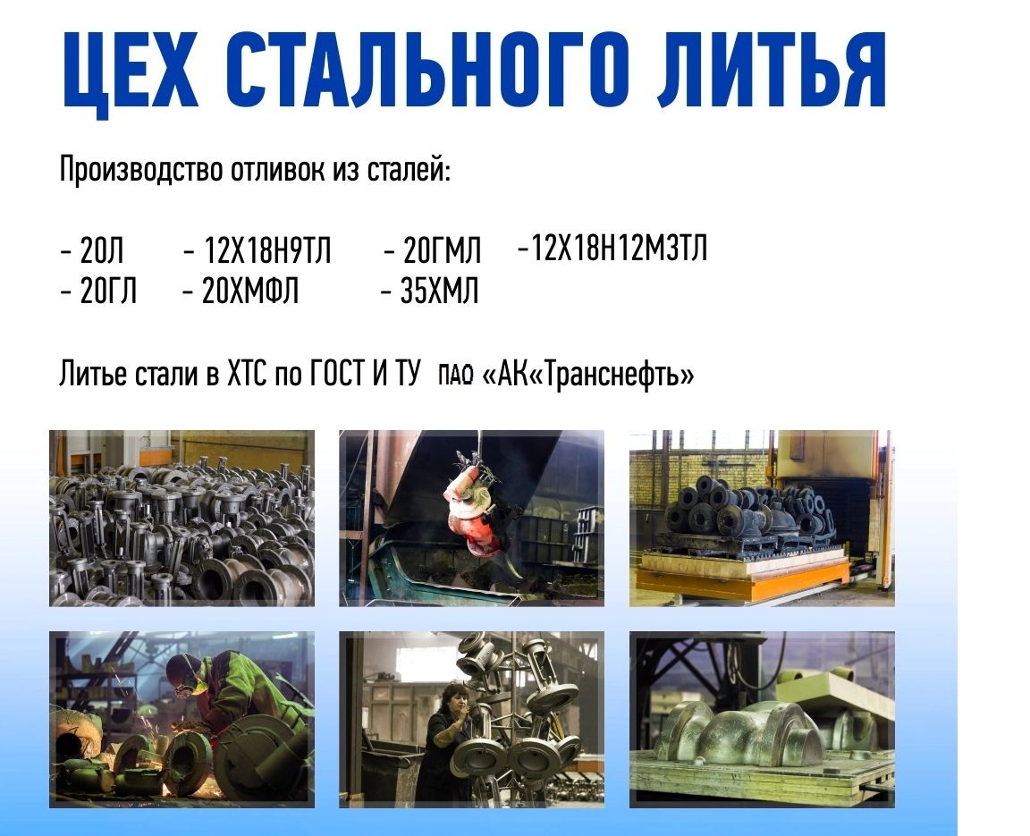 Цех стального литья оборудован линией формовки ХТС, применение современных технологий позволяет нам гарантировать качество литья по 9 классу точности ГОСТ Р 53464-2009.